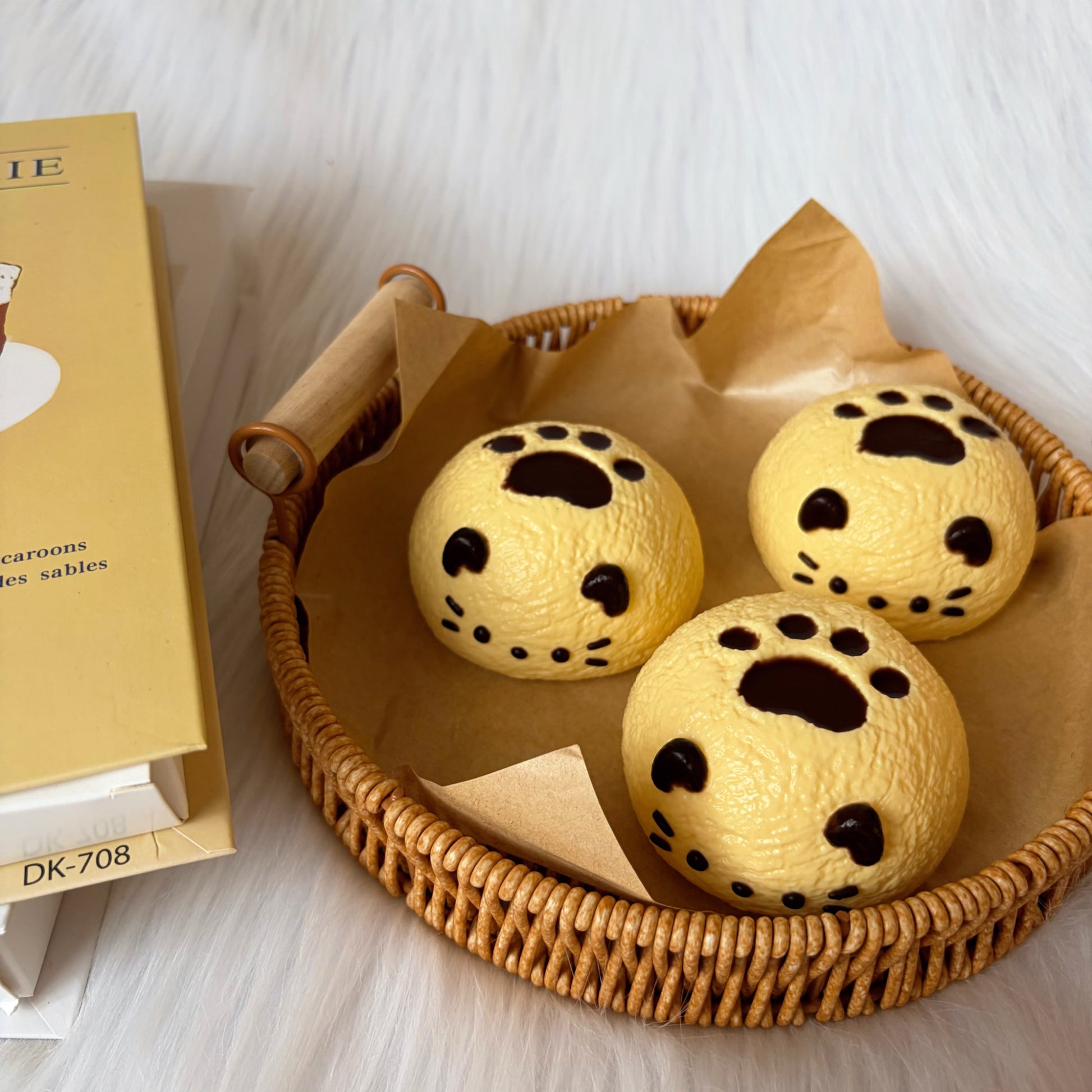 Kitty Bun looks like a freshly baked sweet bun with the cutest surprise on top — a little chocolate paw print and tiny kitty face details that make it impossible not to smile. The warm buttery-yellow tone and soft textured surface give it that realistic bakery vibe, but way cuter.