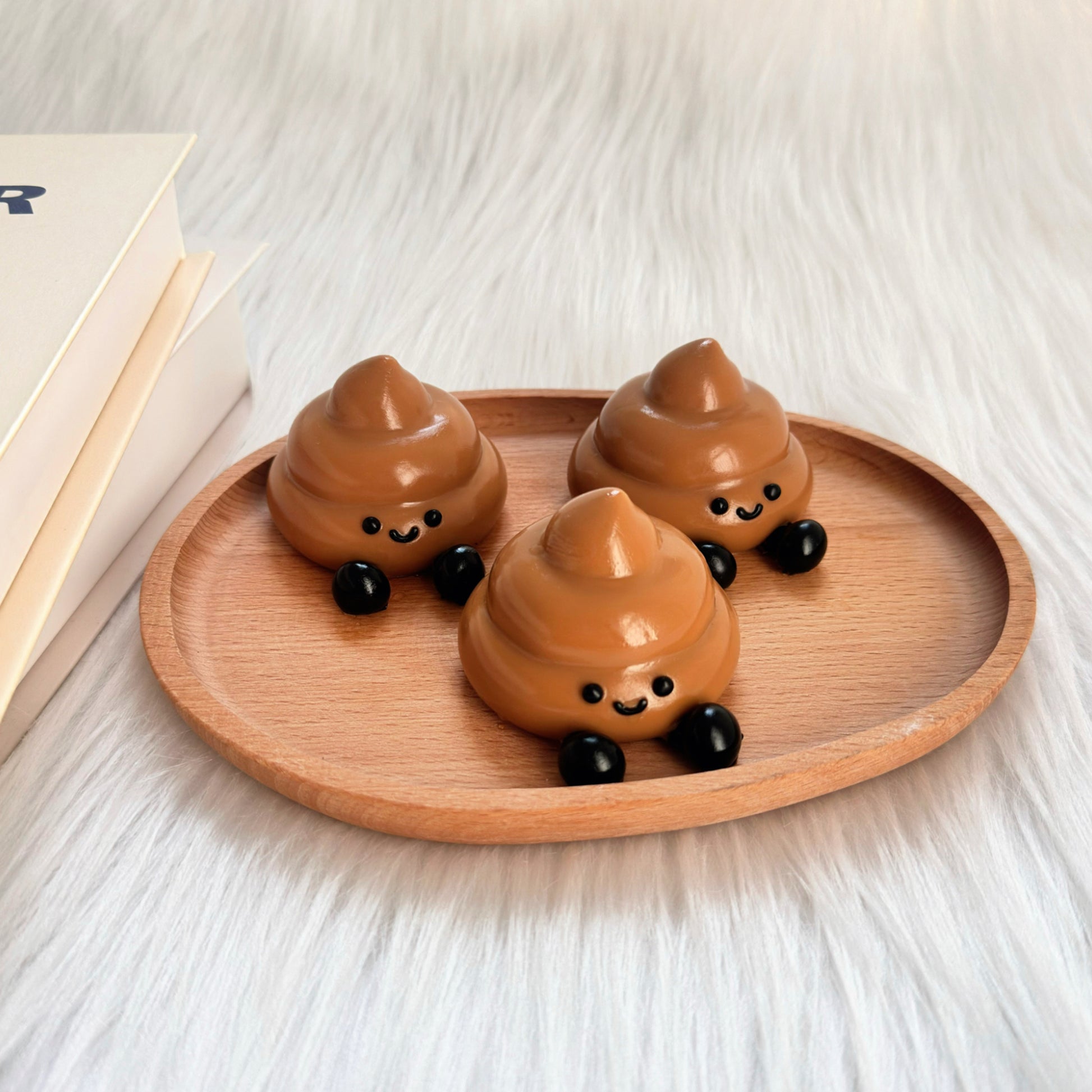 Classic swirl poop shape with a happy face and tiny feet for extra personality.