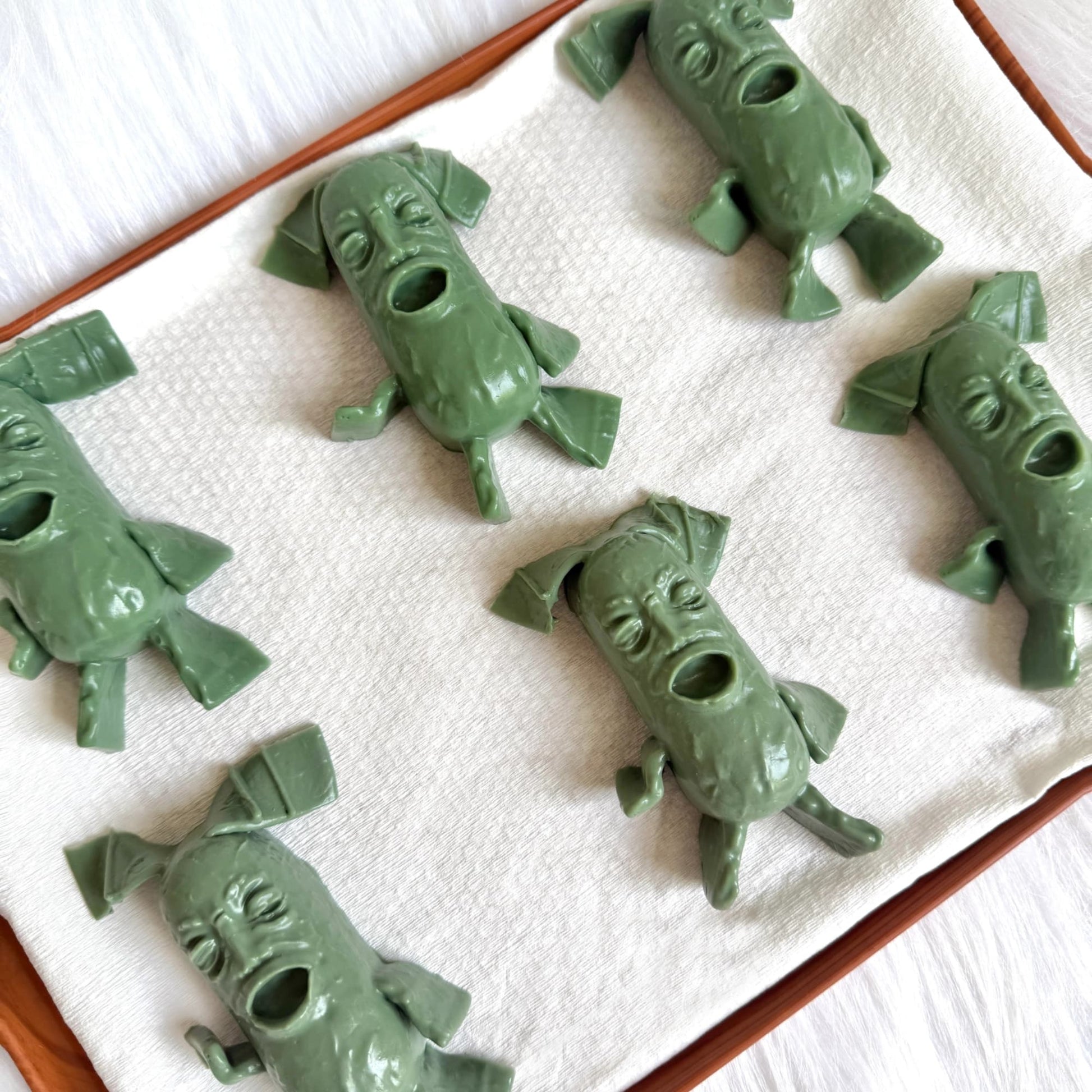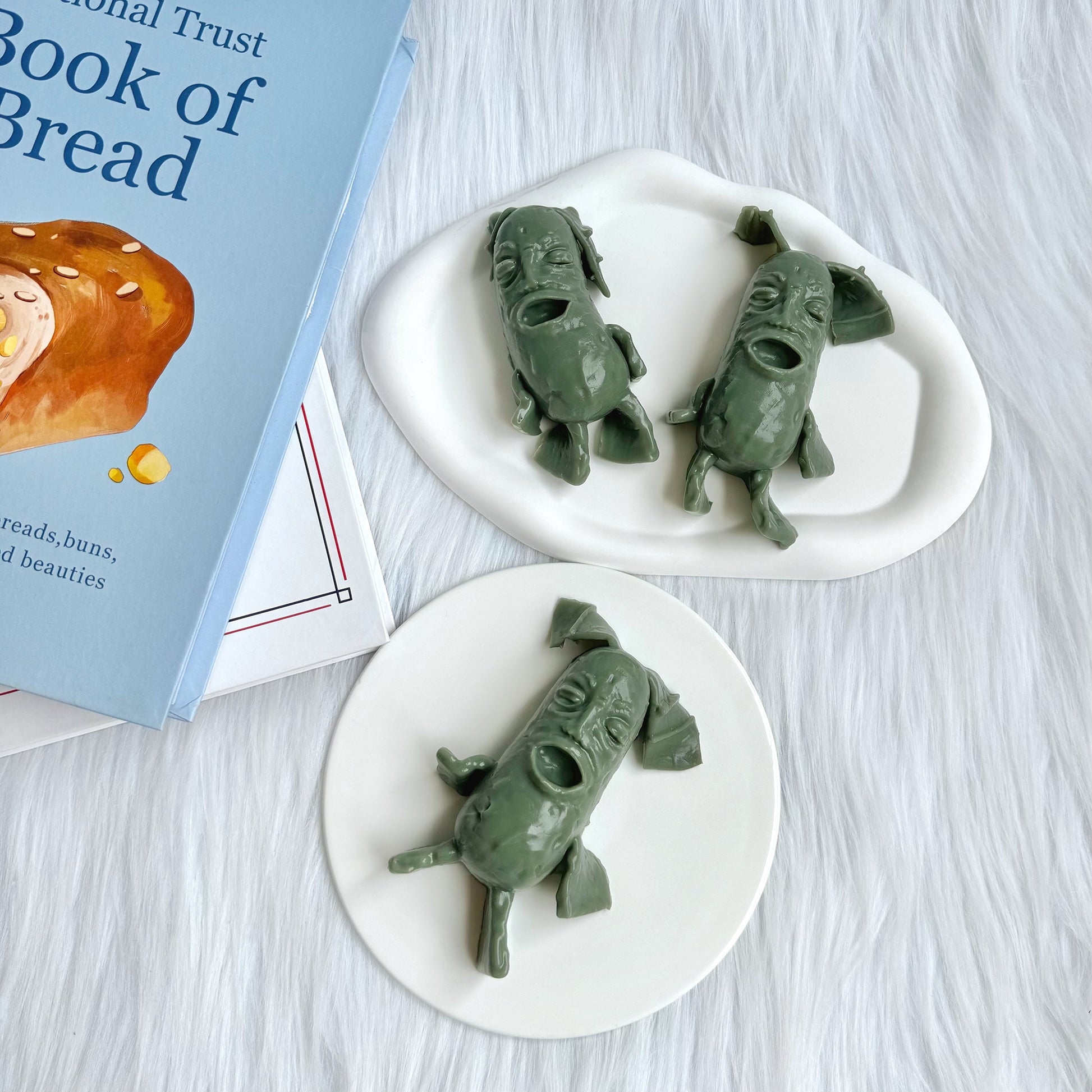 A strange little thing. He’s green, weirdly confident, and that wide open mouth makes it feel like he’s about to roast you any second. 🥒💬